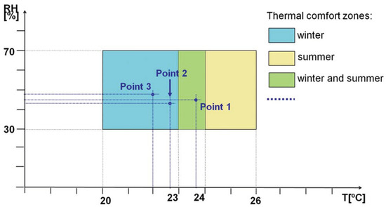 In the case of thermal comfort assessment, a simplified method was used, which does not require a complicated set of measuring equipment. The assessment criterion is the comfort zone defined in ISO 7730:2005 [38] for the winter season. The average values of air temperature and relative humidity measured in the three vehicle zones are referred to the permissible ranges of these values, as in Figure 2.