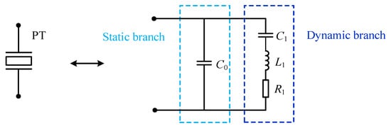 In order to analyze the electrical behavior characteristics and characteristic frequencies of the piezoelectric transducer, the PT can be modeled by the Butterworth–Van Dyke (BVD) circuit model [] in Figure 1. The equivalent circuit of the PT consists of static and dynamic branches connected in parallel. C0 is the static capacitor, which is the capacitance between the piezoelectric pole plates, so it is a real electrical parameter whose value hardly changes. The dynamic branch consists of the dynamic capacitor C1, dynamic inductor L1, and dynamic resistor R1 in series. The parameters C1, L1, and R1 are the reaction equivalents of the vibration operating state, characterizing the system stiffness, oscillation quality, and losses, respectively. Therefore, factors such as temperature, pressure, and operating conditions can affect the equivalent circuit parameters of the PT.