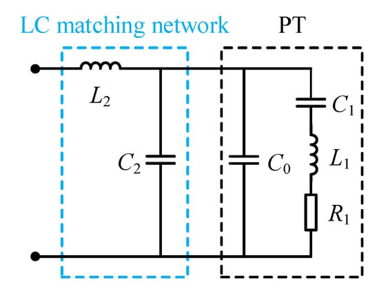 The matching network is connected between the driving power supply and the PT, which plays a key role in the efficient and stable operation of the ultrasonic system. As mentioned earlier, The PT operated at the series resonance frequency is resistive and capacitive. To improve the transmission efficiency, a matching network needs to be designed to compensate for the capacitance, which is called tuning. The inductor–capacitor (LC) matching network is commonly used and is shown in Figure 3, where L2 is the matching inductor and C2 is the matching capacitor [,,]. C2 can make the equivalent resistance lower to play the role of resistance regulation. Moreover, the LC matching network can filter the harmonic components of the ultrasonic power supply output and improve the quality of the voltage waveform applied to the PT.