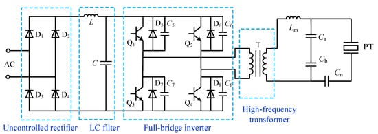 The power circuit topology is shown in Figure 6. The uncontrolled rectifier circuit composed of diodes D1–D4 converts the industrial frequency AC power to DC power and smooths the output after the LC filter circuit. The full-bridge inverter circuit with four IGBTs as switching devices serves to convert DC power into high-frequency AC power. In addition, the IGBTs are connected in parallel with capacitors and diodes to achieve soft switching technology, which effectively reduces the switching losses under high-frequency operating conditions []. The high-frequency transformer converts the inverted voltage into the power ultrasonic signal required by the transducer and acts as an electrical isolator. The improved LC matching network tuned matching makes the piezoelectric transducer work in resonance to produce ultrasonic waves.