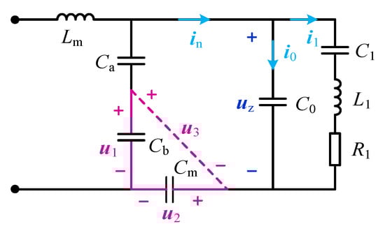 In order to indirectly analyze the dynamic branch through the matching network, the conventional LC matching circuit is improved, and the improved LC matching circuit is shown in Figure 4, where Lm is the matching inductor and Ca, Cb, and Cn are the matching capacitors. The values of the matching network parameters are designed according to the PT operating at the series resonance frequency.