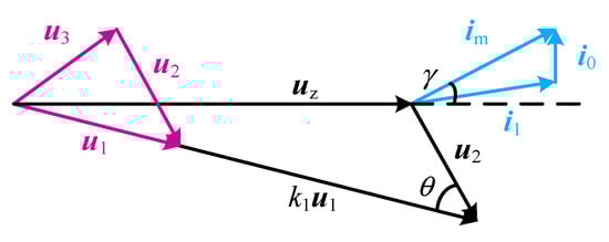 where k1, the voltage division factor, is the ratio of the voltage on Ca and Cb to the voltage on Cb, and k1 = (Ca + Cb)/Ca. From Equation (6), the vector relationship is shown in Figure 8. Here, uz is perpendicular to i0 and u2 is perpendicular to in. Let the angle between in and uz be γ.