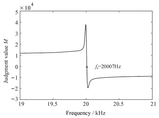 The ultrasonic system simulation model is built in MATLAB/Simulink platform. Taking the PT with series resonant frequency 20,007 Hz as the object, the relationship between the judgment value M and frequency f is obtained as shown in Figure 10. As can be seen from Figure 10, the judgment value M is 0 at the series resonant frequency fs = 20,007 Hz, and |M| ≈ 2000 when the frequency differs from the series resonant frequency by 1 Hz. The resonant frequency fs can be tracked by controlling M within a certain range, and the control accuracy is high. In addition, near the series resonant frequency, the judgment value M changes quickly with frequency, while away from the series resonant frequency, the M changes relatively slowly.
