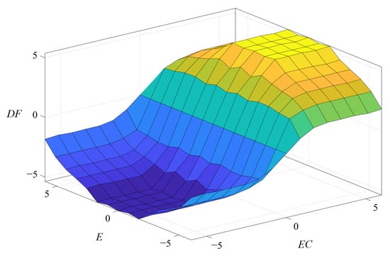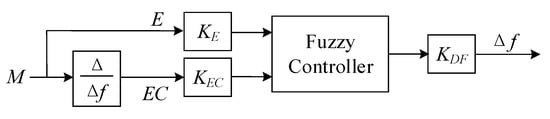 Fuzzy control is based on fuzzy set theory, fuzzy linguistic variables, and fuzzy logic reasoning, which does not require an accurate mathematical model of the controlled object and has strong adaptability to nonlinear and unstable control objects. Based on the above analysis, this paper adopts fuzzy control for frequency tracking. A two-dimensional fuzzy controller with E, EC, and DF as fuzzy variables is used. The input variables of the fuzzy control are the judgment value E = M and the relative frequency change rate EC = ∆M/∆f of the judgment value M. The output variable is the frequency change DF. The block diagram of the fuzzy control system is shown in Figure 11.