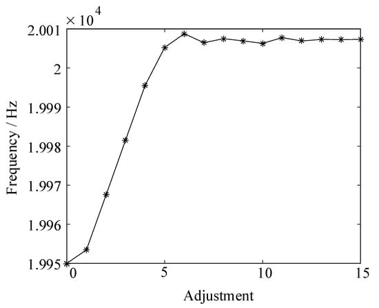 After 5 frequency adjustments by the fuzzy controller, the judgment value M decreases, the frequency adjustment size starts to decrease, and the frequency approaches the series resonant frequency. After 8 frequency adjustments, the frequency is basically stabilized at the series resonant frequency of 20,007 Hz with an accuracy of 1 Hz, which achieves the rapidity and accuracy of frequency tracking.