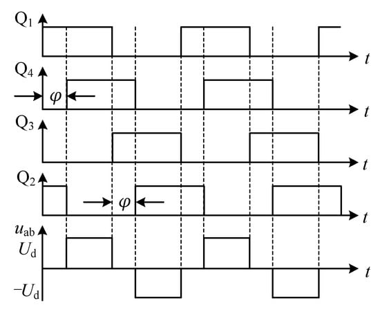The phase shift pulse width modulation (PS-PWM) method is to regulate the duty cycle of the output voltage and the output power by changing the phase difference between the conduction of the two bridge arms of the full-bridge inverter circuit, i.e., the phase shift angle φ [,]. The IGBT driving waveforms and output voltage waveform of the PS-PWM method are shown in Figure 15, where Ud is the output voltage amplitude.
