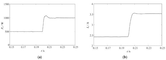 The simulation is built in MATLAB to verify the power regulation of the dual closed-loop control. The power regulation process is shown in Figure 17 after 0.2 s of sudden change in the given power value from 500 W to 1000 W. After 0.02 s of regulation time, the power and current re-stabilize, and the power stabilizes at the given value of 1000 W and the current stabilizes at 3.5 A. The power and current overshoot during the regulation process is 7.8% and 1.7%, both of which are small. The simulation results verify that the dual closed-loop control has good stability.