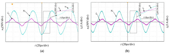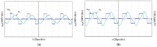 Figure 20a,b show the waveforms of full-bridge inverter output voltage and PT voltage when the PT works in a resonance state and the phase shift angle φ is 120° and 90°, respectively. As the phase shift angle decreases, the inverter output voltage duty cycle increases, and the voltage at both ends of the transducer increases, which shows that the power can be continuously adjusted by changing the phase shift angle.
