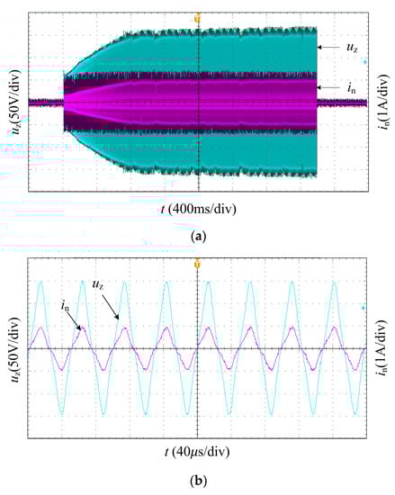 Power regulation experiment waveforms: (a) PT voltage uz and current in of the power regulation process for a given power of 100 W; (b) PT voltage uz and current in when the power is 100 W.