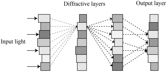 The diffractive propagation process in the network is shown in Figure 5. For a fully linear optical network, the entire process from data input, through network propagation, to final output can be regarded as a matrix operation of a network layer. However, it is difficult for a single diffractive layer to perform the mathematical operations completed by multiple diffractive planes, so it instead provides a basis for the depth advantage of multi-layer networks. To compare the differences between diffractive networks and fully connected neural networks (FCNN), the neuron propagation function of FCNN is given: