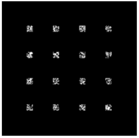 In the network, a convolutional layer containing a standard 16-channel 9 × 9 convolutional kernel and a 5-layer diffraction fully connected layer containing 5 × 200 × 200 neurons were designed. According to the characteristics of the 4f system, the 16-channel convolutional kernels were tiled in space. At the same time, the 5-layer diffractive fully connected layer can exhibit good classification performance of DNN without convolutional operations. Table 1 shows the distribution of pixels in the model. Taking the MNIST dataset as an example, the input image of 28 × 28 pixels size was expanded to 200 × 200 with zero padding. In the convolution layer, 16 convolution kernels were discretized into a 4 × 4 array and tiled into a 200 × 200 size planar space, as shown in Figure 6. Then, the input image was convolved with the tiled plane. The output feature map directly entered the fully connected layer, consisting of five diffraction layers for feature reduction. Finally, we obtained the result of the intensity distribution of the output plane.