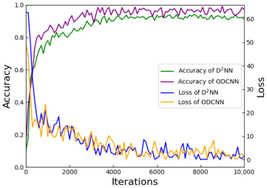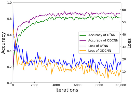 This improvement in accuracy is also reflected for the Fashion–MNIST dataset, as shown in Figure 8. After adding the convolutional layer, ODCNN improved the classification accuracy from 82.1% to 86.75%. As well, the convergence of the loss curve was faster. After 2500 iterations, the ODCNN reached convergence, while the benchmark network required 4000 iterations. Compared with the 5-layer diffraction network, the classification accuracy of ODCNN was improved to different degrees on both datasets, which proves the necessity of feature extraction in image classification tasks. The convergence speed of the loss curve also indicates that ODCNN can determine the best combination of parameters faster.