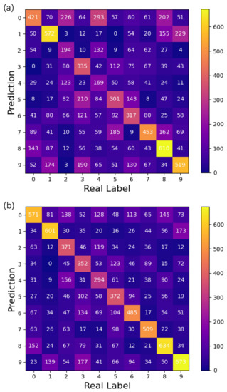 Further, we chose the more complex CIFAR-10 dataset to verify the impact of the convolutional layer on the classification performance, which consists of 3-channel RGB images of real-world objects with more noise and complex scale features. Since the system was programmed to handle monochromatic light, the images were grayscaled before training, turning them into one-dimensional images. Figure 9 shows the classification results of the two networks on the ten classes of images in this dataset using confusion matrices. The relative distribution of the confusion matrices of the two networks was the same, i.e., there was a limitation in predicting a certain class of images. However, the number of misclassifications, such as erroneously labeling “2” and “4” images as “0” and misclassifying “3” images as “5”, significantly decreased compared to previous instances. Although ODCNN fails to change the relative distribution of results, the ability of the convolutional structure to extract useful information reduces its overall classification error rate. On this dataset, the overall accuracy increased from 39.4% to 49.35%.