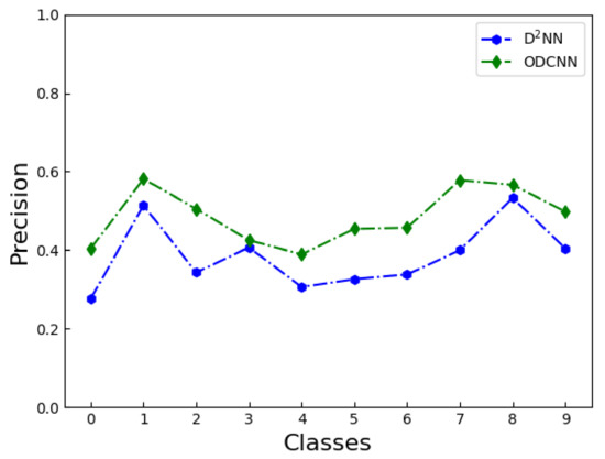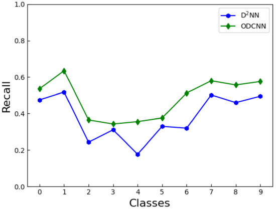 To reflect the classification effect of the two networks on the ten types of images in the CIFAR-10 dataset, Figure 10 and Figure 11 show the precision and recall rate corresponding to each type of image, respectively. The precision refers to the number of correctly classified images in each type of result, reflecting the accuracy of the network. The recall reflects the ability of the model to find positive samples. The ODCNN achieved a higher precision for all ten classes of images, with an average improvement of about 10%. In terms of recall rate, ODCNN also achieved an overall advantage. However, when we focused on one of the image categories, the two indicators did not improve by the same amount. Depending on the classification task, precision and recall have different emphases, but, in this experiment, the two indicators were equally important. Therefore, we chose a more robust indicator, the ROC curve, to compare the performance of the two models.