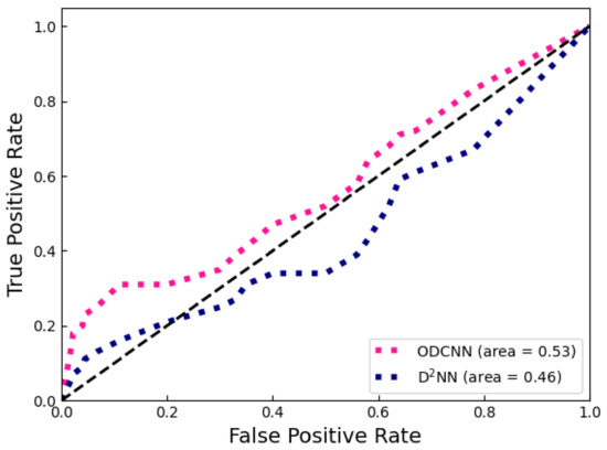 When the sample distribution is imbalanced, the ROC curve can more stably reflect the quality of the model. The curve takes the False Positive Rate (FPR) and True Positive Rate (TPR) as the horizontal and vertical coordinates. It consists of the performance of multiple classifiers on test samples. Therefore, the ROC curve characterizes how the classifier performance varies with the threshold value. In addition, the size of the area under it is called AUC, which can quantitatively describe the difference between classifiers. As shown in Figure 12, the ROC curves of ODCNN were all above DNN. The ODCNN tends to achieve higher TPR with the same threshold, which means it provides more positive predictions. In addition, the AUC of ODCNN and DNN were 0.53 and 0.46, respectively, which indicates that ODCNN has a higher accuracy. The AUC of DNN on CIFAR-10 was less than 0.5, and its prediction accuracy was even lower than random prediction. The addition of the convolutional layer improved the AUC of the model, making it predictive when a reasonable threshold was set.