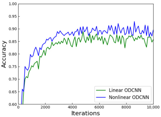 where x represents the light intensity and represents the threshold coefficient. When the input light intensity surpasses the threshold intensity, the transmission proceeds normally; conversely, the output light intensity decreases to zero. The optimal size of the threshold coefficient varies depending on the dataset. We characterized the improved ODCNN using the Fashion–MNIST dataset, and the threshold coefficient was 0.4. The results in Figure 13 illustrate that the nonlinear ODCNN achieved higher accuracy and improved convergence speed. The nonlinear layer can be realized by adjusting the camera curve of sCMOS [29]. Moreover, composite materials such as photorefractive crystals(SBN:60) [30] show excellent nonlinear properties in the optical field, promising the implementation of nonlinear functions in optical neural networks.