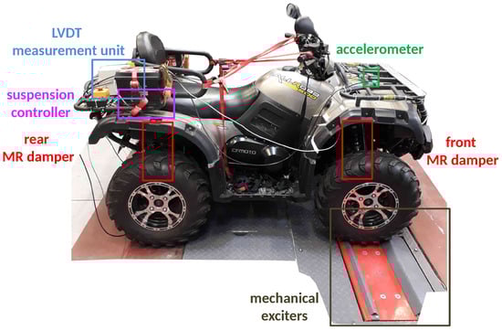 The presented article is dedicated to an actual commercially available and real-size all-terrain vehicle (ATV) in which original shock absorbers were replaced with suspension MR dampers (see, e.g., [35]), presented in Figure 1. Numerous sensors available in the vehicle, e.g., an accelerometer, force sensors, suspension deflection sensors, and sensors of electric currents, which control the instantaneous damping parameters of MR dampers, allow for the comprehensive analysis of vibration propagation in the considered vehicle. Experiments were carried out using a modified diagnostic station that includes two mechanical exciters that generate the harmonic excitation of the selected frequency for the front wheels of the vehicle.