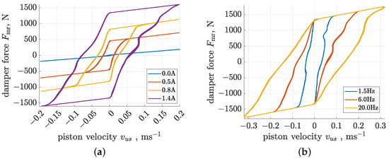 Force–velocity characteristics of the implemented Bouc–Wen damper model demonstrated for selected configurations of sinusoidal piston excitation and control current : (a) model responses obtained for sinusoidal excitation at 6 Hz, 5 mm, and several control currents; (b) model responses obtained for control current equal to 1.4 A and different configurations of sinusoidal excitation.