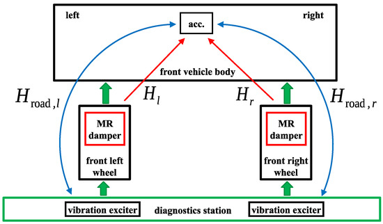 The potential future development of the vehicle model that is coupled with the diagnostic station and mechanical exciters can be carried out from several aspects. For instance, the following identification of the vehicle model currently does not takes into account resonance peaks visible within the frequency range from 21.5 Hz for the transfer function dedicated to the right MR damper and within the frequency range from 14.5 to 18 Hz in the case of the left MR damper. However, a major exception is that the control-related signal paths of the implemented model do not include the second resonance peak visible within the frequency range from 4 to 7.5 Hz, especially the part that is independent of the control current.