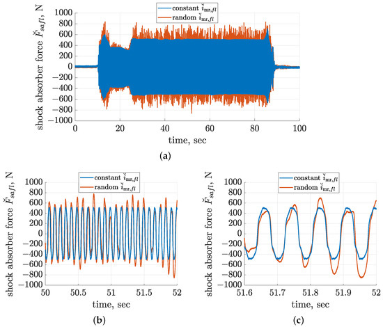 Comparison of time diagrams of force generated by the front left shock absorber related to constant and random control currents evaluated based on experimental results and related to the second configuration with an average control current equal to 0.36 A and a standard deviation equal to 0.15 A: (a) the whole experiment, (b) time range of 50–52 s, and (c) time range of 51.6–52 s.