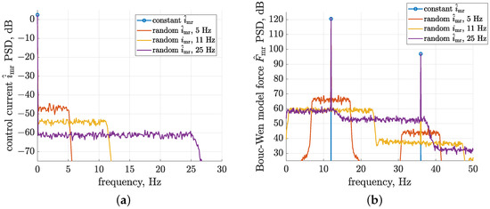 Simulated effect of Bouc–Wen MR damper model subjected to piston displacement road-related excitation with 1 mm amplitude and 12 Hz frequency modulated by a constant or a wide-band low-pass random control current with bandwidth of 5, 11, or 25 Hz: (a) PSD frequency characteristics of different cases of control current ; (b) PSD frequency characteristics of corresponding force responses of Bouc–Wen model .