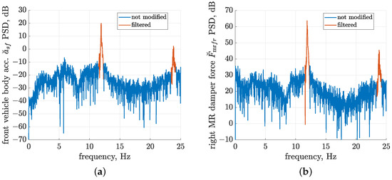 The applied sensors measure the force generated by shock absorbers, including suspension MR dampers and springs. However, the identification of control-related signal paths is limited to suspension MR dampers only. Thus, the compensation of the spring forces is treated as the first phase of the presented filtering procedure. The compensation is carried out on the basis of the measured force, as defined by the inverse of Equation (6). As a consequence, the spring force that is added for each suspension part is estimated using a previously identified and known stiffness parameter and the shock-absorber deflection measured by the corresponding LVDT sensor.