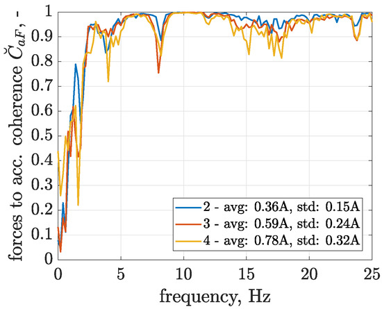 Data sets of processed force and acceleration measurement signals with a length equal to 48 s corresponding to the most stable operation of mechanical exciters were selected for each configuration of control currents. The estimation of the transfer function evaluated in the frequency domain for both signal paths, denoted by and , was carried out using the tfestimate function implemented in the Matlab environment according to the algorithm presented in [50]. Here, its variant dedicated to multiple-input systems was applied according to the following formula: