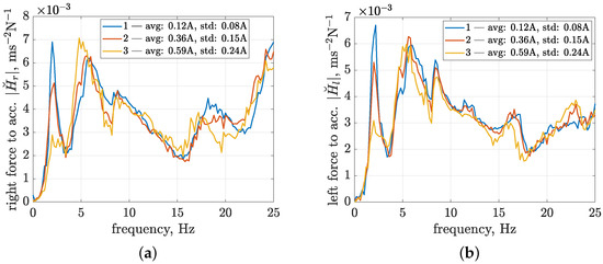 The identification results are presented for the first three configurations of control currents in Figure 11 in the form of absolute frequency characteristics of the estimated transfer functions. The frequency characteristics of the last configuration, which correspond to an average control current equal to 0.78 A and a standard deviation equal to 0.32 A, are comparable to the third configuration. Thus, they are omitted to improve the clarity of the presentation. The analysis is focused on a frequency range up to 25 Hz since it is commonly exploited in the literature when discussing the influence of vibration on vehicles and passengers and dealing with corresponding methods of suspension control.