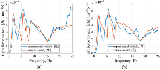 Frequency characteristics of absolute transfer functions of control-related signal paths evaluated based on experimental results (,) and related to the second configuration with an average control current equal to 0.36 A and a standard deviation equal to 0.15 A, compared to transfer functions evaluated for the simulated responses of the identified vehicle model including mechanical exciters (,) related to (a) the right suspension part; (b) the left suspension part.
