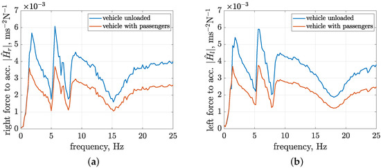Comparison of frequency characteristics of absolute transfer functions of control-related signal paths and , evaluated for the simulated responses of the identified vehicle model unloaded or with passengers, related to (a) the right suspension part; (b) the left suspension part.