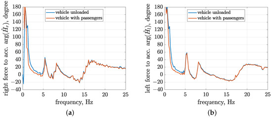 Comparison of frequency characteristics obtained for phase shift of transfer functions dedicated to control-related signal paths and and evaluated for the simulated responses of the identified vehicle model unloaded or with passengers, related to (a) the right suspension part; (b) the left suspension part.