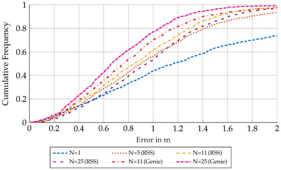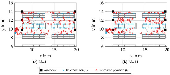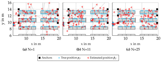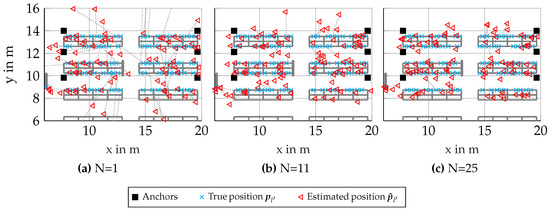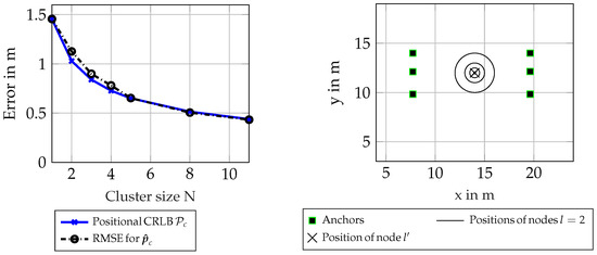 For placement of the antenna arrays, see Figure 2. All antenna-arrays are shown as squares, and the positions of all nodes l are shown as a black cross. The arrays are all oriented such that they are spaced in the direction of the y-axis; therefore, the positioning performance improves with the aperture of the arrays. The nodes are placed at . For this scenario, 1100 realizations of a channel incorporating DMC was chosen, with an SNR at m of , where is the equivalent amplitude of the normalized signal at m. The cluster-size N was varied, where the first node was always one unique node from all 1110 simulated nodes, and every other node in the set was chosen randomly from all other remaining nodes.