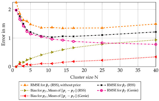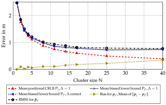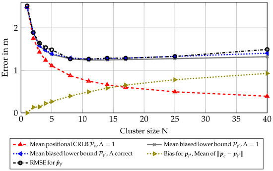 Figure 2 shows that the CRLB can be attained for this scenario, as the curve showing the RMSE for is almost identical to the theoretical bound. A small offset can be seen for small cluster sizes (i.e., N in the range of 2 to 4), which can be attributed to the particle-based estimation not being perfect. This could be mitigated by using more particles. Note that the bias and correction factor were both zero for all different cluster sizes in this scenario, and therefore, the equivalent Fisher information (EFI) could be directly summed up, meaning the CRLB scaled with , which can be interpreted as using different realizations from the same node.