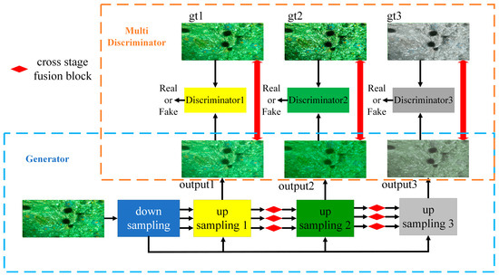 The generator structure of ECO-GAN, as depicted in Figure 2, comprises three parts: downsampled feature extraction, upsampled image recovery, and cross-stage fusion. The main functions of the generator include luminance enhancement, blur removal, and white balance.