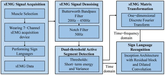 The raw sEMG signal contains various noises caused by motion artifacts and power frequency interference [25]. Thus, we first utilized a 20–450 Hz Butterworth bandpass filter to filter out noise derived from motion artifacts. Then, a 50 Hz notch filter was used to filter the power frequency interference noise.
