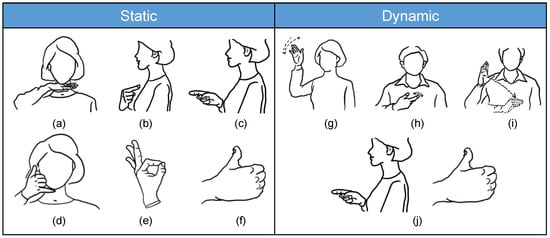 Ten sign languages signs incorporating both static and dynamic gestures were employed in this study (Figure 2). Static sign language is defined as the finger, wrist, and upper limb maintaining just one form during the performance of sign language, while dynamic sign language is defined as the finger, wrist, and upper limb needing to adopt multiple forms during the performance of sign language.