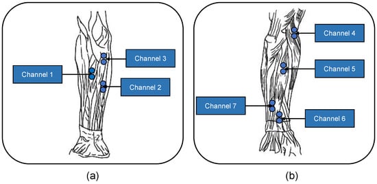 Placement positions of the electrodes. (a) The anterior group of antebrachial muscles and (b) the posterior group of antebrachial muscles. Blue solid circles denote the two Ag/AgCl electrodes corresponding to one channel.