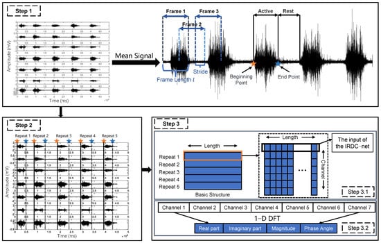 Illustration of data segmentation. Step 1 and Step 2 describe the 7−channel sEMG signal segmentation process of one sign language movement, Step 3 describes the process of constructing the time domain (Step 3.1) and the time−frequency domain (Step 3.2) datasets. The orange box in Step 3.1 represents the seven−channel sEMG signal of Repeat 1.