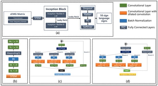 Based on the above analysis and focusing on long-term sequence sEMG sign language signal recognition, we used the Inception architecture as the backbone of our classification framework to obtain sufficient feature information for the sEMG signal. Furthermore, to further improve the accuracy of the sEMG-based SLR tasks, we first combined the dilation convolution and residual modules to avoid the degradation problem while enlarging the receptive field. The main contributions and novelties of this study are as follows: