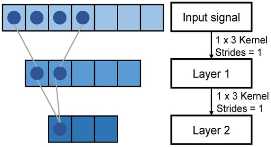 The feature map extracted by the convolutional layers can be mapped back to the input signal; the size of the feature map mapped back to the input is the receptive field size. As shown in Figure 6, after the 2 convolutional filters with kernel sizes of 1 × 3 and 1 × 2, each element in Layer 2 contains information about the input signal with a length of 4. The larger the size of the receptive field, the more information the feature map contains about the input signal, which means the feature map may contain more global and higher-level semantic features. Hence, a large receptive field is suitable for long-term sEMG-signal-based SLR tasks.