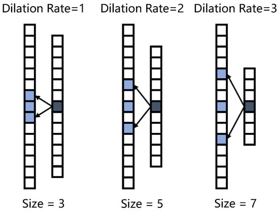 Representation of dilated convolution. The “size” at the bottom indicates the receptive field size. The blue box denotes the convolution kernel. The blue-grey box denotes the convolution results. A dilation rate of 1 means that the convolution kernel was still a standard kernel.