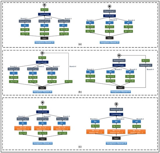 The main goal of IRDC-net was to increase the receptive field to adapt to the task of classifying long-term sequences and to enhance the feature capture capabilities of long-term sequences. Therefore, this study combined dilated convolution and a residual module to expand the receptive field while avoiding the model degradation problem caused by increasing the depth of the model. These ablation experiments verified that the decrease in classification performance due to the reduced receptive field size was caused by (a) the removal of the dilated convolution module and (b) the model degradation problem after the removal of the residual module. The ablation experiments were all based on the Mydata and Ninapro DB1 datasets, and the time–frequency information for the two datasets was used as the input of the classification model. The model structures of this ablation experiment are shown in Figure 9.