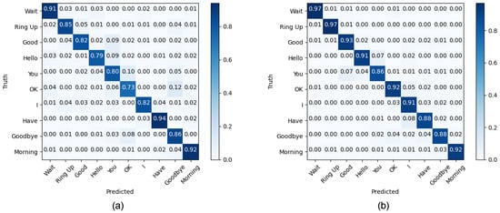 As shown in Figure 10, we also presented a confusion matrix for the classification results of IRDC-net on Mydata. For the time domain dataset of Mydata, the recall of “OK” was relatively poor. After applying DFT, the recall increased from 0.73 to 0.92. This result almost concurs with the discussions in the previous paragraph. However, for the dynamic sign language gesture “Have”, the recall decreased from 0.94 to 0.88. The reason for this may be that the degree of muscle activation during dynamic gestures varied greatly among subjects; therefore, some uncertainty about the recognition results was still present. Figure 10 also shows that there was a mutual misclassification between “Hello”, “You”, and “Good”, since the dynamic sign language gesture for “Hello” consists of the gestures for “You” and “Good”, and the distance between the features may be smaller than it is for other highly differentiated sign language gestures. There is a chance that when the subjects performed “Hello”, the gesture for “You” took longer to perform than the gesture for “Good”, causing the whole signal to be biased towards “You”. Therefore, the dynamic sign language gesture for “Hello” was misclassified as “You” and “Good”.
