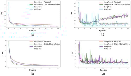 The results also demonstrated that the dilated convolution and residual module improve the classification performance (Table 5). Figure 11b,d show that, after removing the dilated convolution, the training error increased slightly. This is because dilated convolution works to enlarge the receptive field size, which can then capture more information from the model’s input; the increase in the training error can, therefore, be attributed to the reduction in the receptive field size.