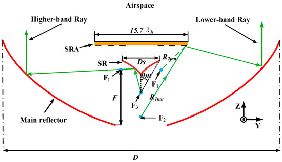 - According to the geometric optics (GO) theory, lower-band rays emerging from the point F2 are first reflected by the SRA. Then, the rays reach the main reflector. Finally, the rays are reflected into the airspace along the Z axis. The dashed line in Figure 2 represents the virtual ray path from the SRA to the focal point F1, which the ray does not actually pass through. The SR can provide the compensation phase for lower-band rays and, as a result, the virtual rays arriving at focal point F1 are in phase. Based on the different lengths of lower-band ray paths, the desired compensation phase for SRA elements in various locations can be calculated.