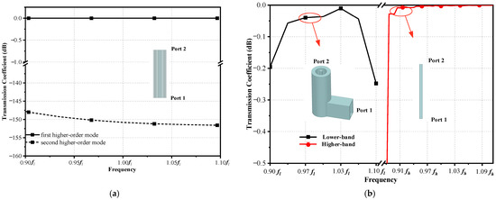 Simulated transmission coefficients of waveguide: (a) Coaxial waveguide within lower band. (b) Coaxial waveguide with waveguide connector and circular waveguide.