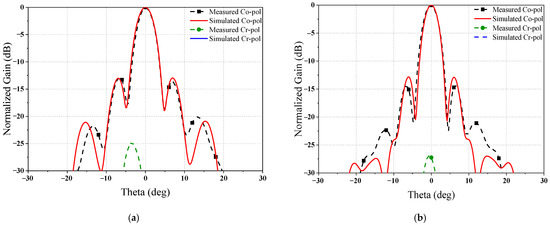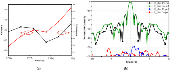 The simulated gain and aperture efficiency in the higher band are shown in Figure 6, based on the full-wave simulations. As a result, the reflector antenna achieves a gain higher than 43 dBi and an aperture efficiency higher than 39% over the entire higher band. Meanwhile, a relative 2 dB gain bandwidth of the higher operating band is approximately 20%, around fh. Furthermore, the simulated normalized co-polarization (Co-pol) and cross-polarization (Cr-pol) radiation patterns at fh are shown in Figure 6b. The simulated Cr-pol patterns are −50 dB lower than the maximum direction in both E- and H-planes.