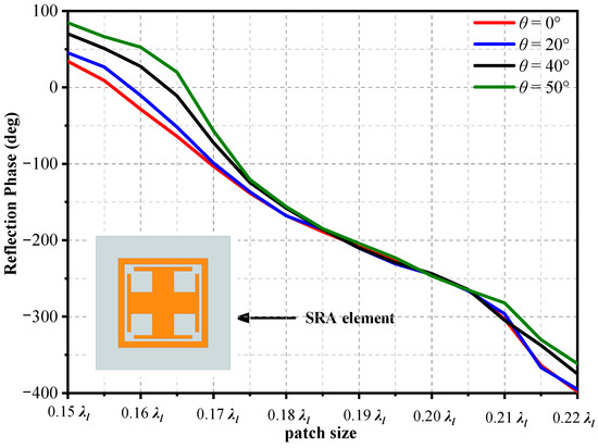 Due to the small diameter of the SRA, a subwavelength element is employed as the element of the SRA. It can more accurately achieve phase compensation than a half-wavelength element in such a small area. The SRA element consists of a cross patch and a rectangular loop [28], as shown in Figure 7. In addition, the size length of the square element is L = 0.23λl, where λl is the free-space wavelength at fl. The element is etched on a 0.077λl thick dielectric substrate with a relative permittivity of 2.2, and a dielectric loss tangent of 0.0009. The reflection phase curves consider different polarizations of the incident wave. The infinite periodic element model is built to simulate the reflection phase at fl. Moreover, another important consideration in the element analysis is the reflection phase under oblique incidences, as shown in Figure 7. Based on the relative position between the SRA and the lower-band feed, the maximum incident angle is about 50°. Then, a max phase range over of 430° is obtained under different incident angles. It can be seen that the reflection phase of the SRA element varies with the incident angle, and the maximum phase change within the oblique incidence range of 0° to 50° is approximately 80°.