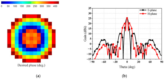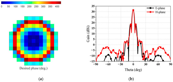In order to decrease the influence of sharp phase variation in the SRA, the value of ΔΦ is designed to be 90°. It can be clearly seen from Figure 9a that no sharp phase variation arises in the middle of the SRA. The area of unavoidable sharp phase variation is moved to the edges of the SRA, not in the middle area, due to the designed ΔΦ. Consequently, the best radiation performance of the reflector antenna is achieved, as shown in Figure 9b. The gain of radiation patterns at fl is 31.4 dBi, corresponding to an antenna aperture efficiency of 59%. Moreover, the optimized radiation patterns show that the high sidelobes are lower than −13 dB. Table 2 summarizes the estimated aperture efficiency and gain loss reduction attribution at fl. The calculated total losses at fl are 2.4 dB, with taper loss as the main loss factor. Shade loss is the shielding of the lower-band SR at fl. Additionally, the simulated gain is close to the calculated gain.