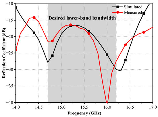 The simulated and measured reflection coefficients of the scaled feed in the Ku band are shown in Figure 11. The Ku-band performance of the scaled prototype can represent the low-band performance of the proposed antenna. There are slight differences between the simulated and measured reflection coefficients, mainly due to fabrication tolerance and assembly misalignment. The measured reflection coefficients are below −15 dB within the desired frequency band of 14.7~16.2 GHz.